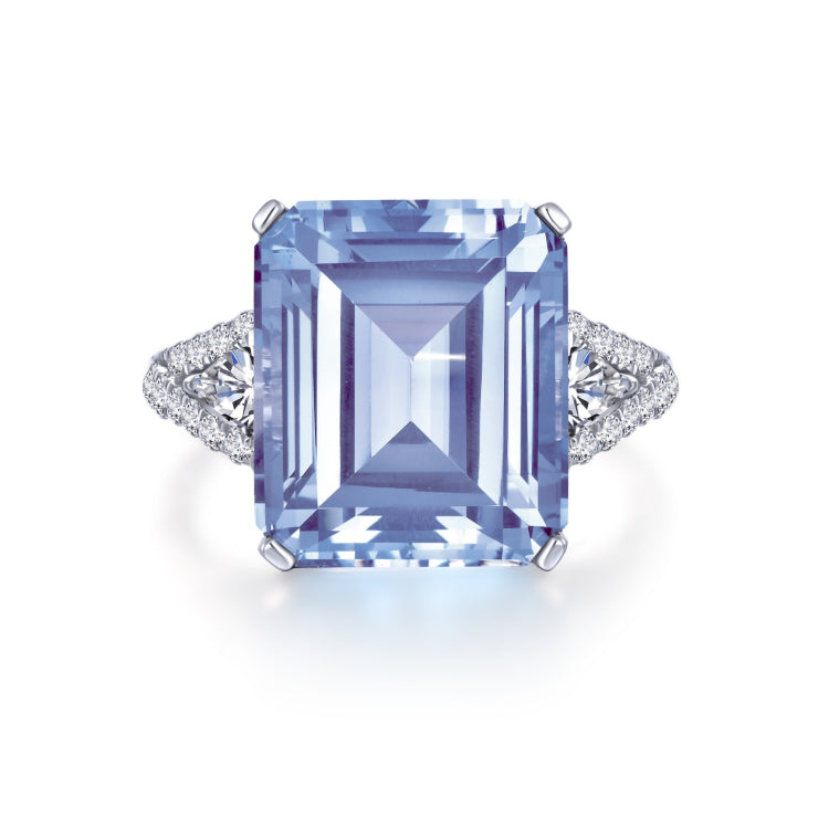 Elegant and sophisticated. This stunning beauty features a Lafonn emerald-cut simulated aquamarine with trillion-cut simulated diamonds on the sides and round simulated diamonds on the shank. This ring is set in sterling silver bonded with platinum.