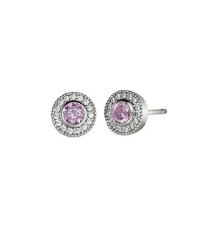 PLATINUM FINISH SS MICROPAVE ROUND SIMULATED PINK SAPPHIRE EARRINGS WITH SIMULATED DIAMONDS